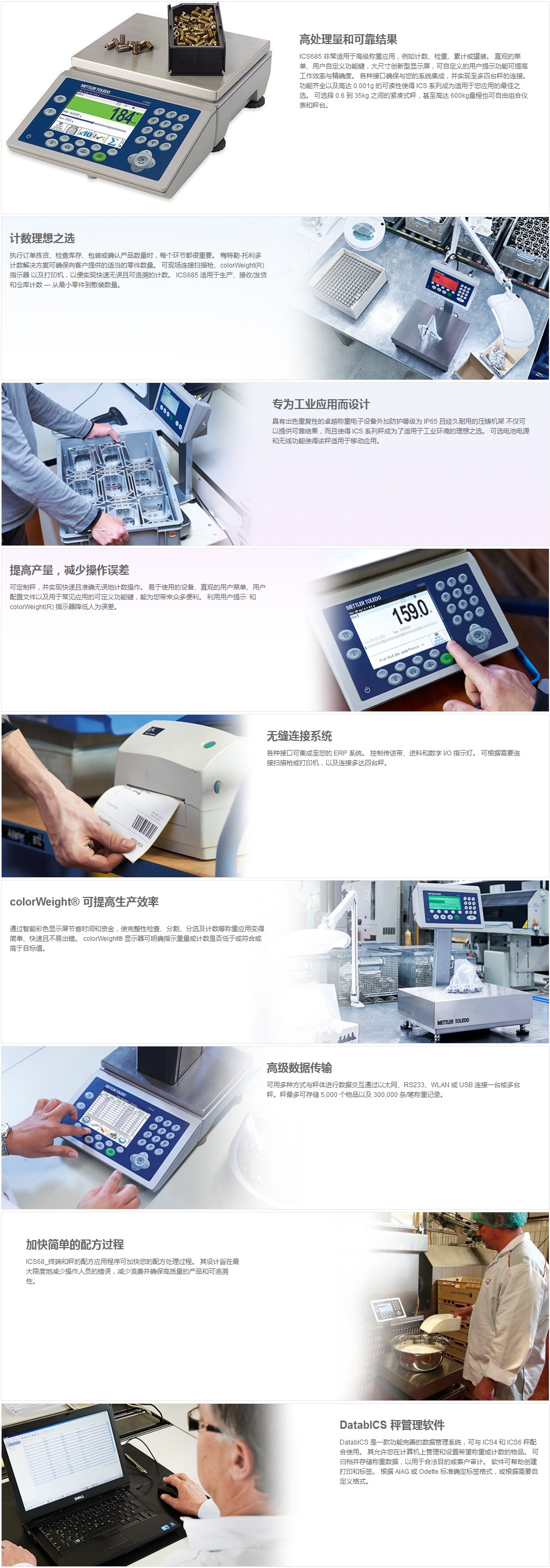 ICS685 非常适用于高级称重应用,例如计数、检重、累计或罐装。 直观的菜单、用户自定义功能键,大尺寸创新型显示屏,可自定义的用户提示功能可提高工作效率与精确度。 各种接口确保与您的系统集成,并实现至多四台秤的连接。 功能齐全以及高达 0.001g 的可读性使得 ICS 系列成为适用于您应用的最佳之选。